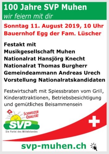 Am 9. Januar 1919 wurde die SVP Muhen als Bauernpartei gegründet. Rund 100 Männer nahmen an der Gründungsversammlung teil. Der Jahresbeitrag betrug CHF 1.